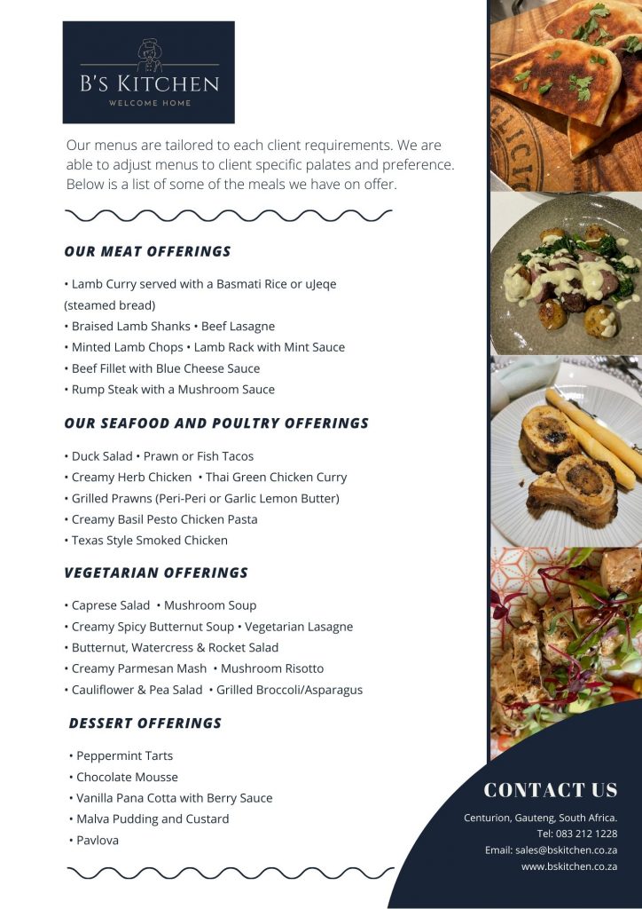 B’s Kitchen was established in 2017, driven by my passion for cooking really good food. High quality and superior client experience are our biggest drivers for the food we prepare. We source our ingredients from the best wholesale and retail suppliers and follow strict protocols in our food preparation, handling and delivery. Our food will take you on a journey into our Kitchen, where we play with food and flavor to create magic. Welcome to our Kitchen. Welcome home.